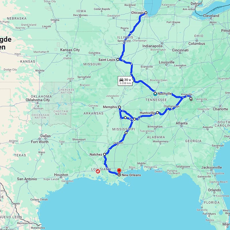 Van Chicago naar New Orleans, een roadtrip van ruim 3000km. dwars door de staten Illinois, Missouri, Kentucky, Tennessee, Alabama, Mississippi en Louisiana van de USA. We huren een auto en gaan lekker op pad. We gaan via Chicago, St. Louis, Nashville, the Great Smokey Mountains, Memphis, Natchez, om uiteindelijk in New Orleans de auto weer in te leveren. De temperaturen lopen steeds verder op naarmate we zuidelijker komen. Tot ver in de 30°C! |